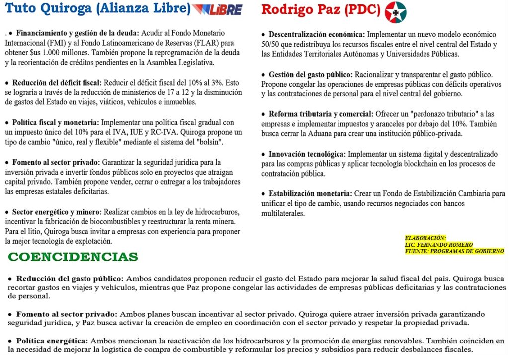 De manera resumida, sencilla y didáctica, presentamos las principales propuestas económicas de los candidatos a la presidencia de Bolivia, Jorge Tuto Quiroga y Rodrigo Paz Pereira, quienes se disputarán la primera magistratura del país en el balotaje previsto para el próximo 19 de octubre.