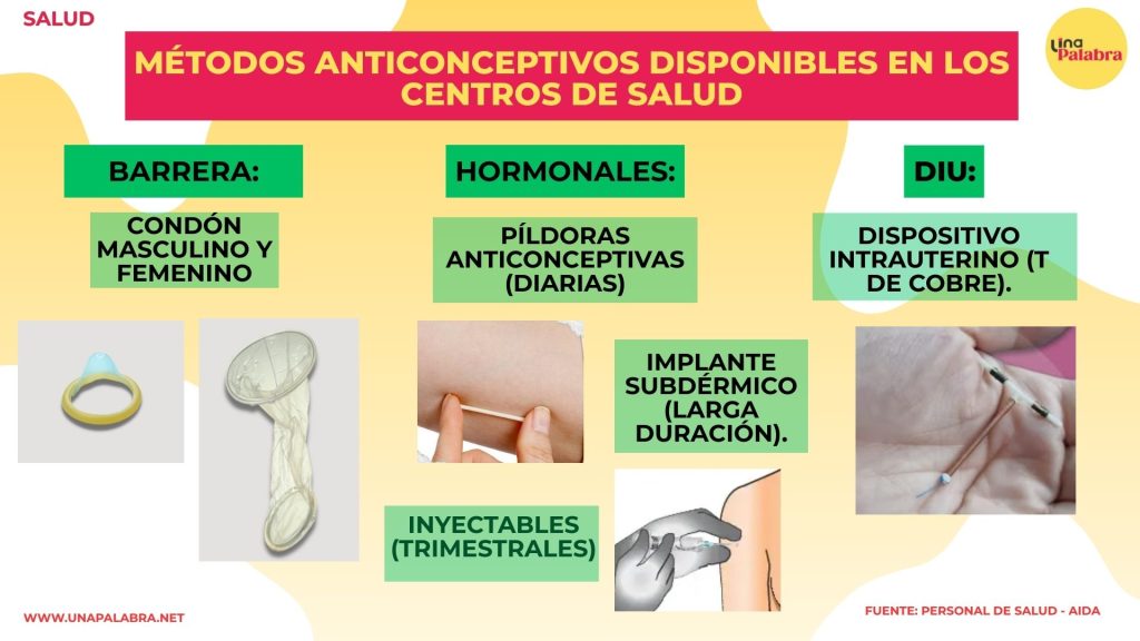 De acuerdo con el personal médico, todos los métodos anticonceptivos aceptados y homologados por el Ministerio de Salud están a disposición de los jóvenes, y destaca que todos son de acceso gratuito en los centros de salud. “Tenemos implantes, la T de cobre, condones masculinos y femeninos, inyecciones trimestrales (Sayana), y, obviamente, damos la orientación para el uso adecuado de los mismos. Los métodos que son más dependientes del usuario, como los condones, requieren una explicación más detallada”, explica Adriazola.