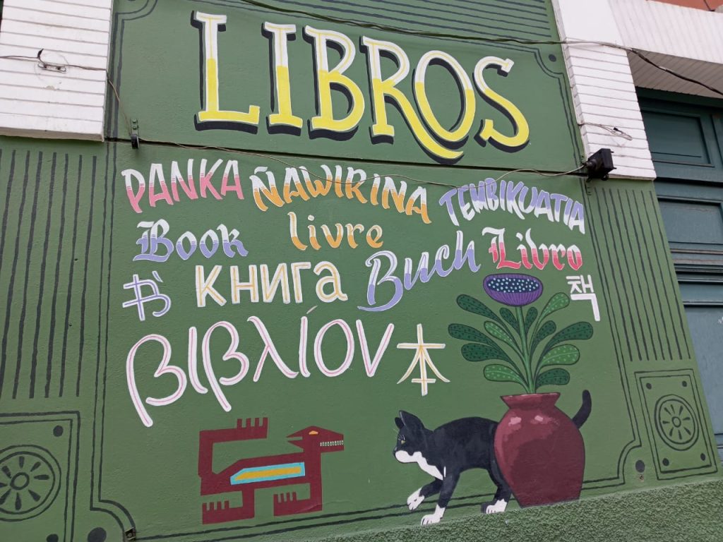 Al salir de la librería me topo con un gato negro y blanco pintado en el mural, acompañado de la palabra libro en varios idiomas, al lado de la puerta de vidrio donde una campanilla anuncia tu ingreso a un mundo repleto de libros, novelas, cuentos, ensayo y poesía que puede cambiarte la vida de una u otra forma.